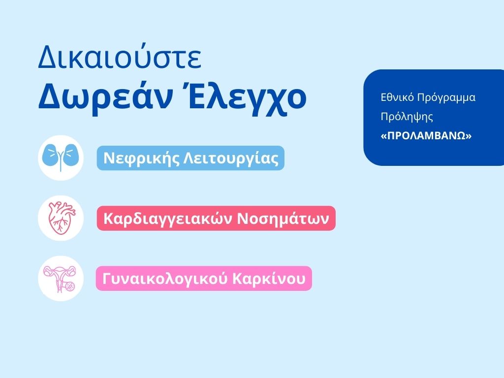 Το πρόγραμμα απευθύνεται σε ασφαλισμένους και ανασφάλιστους πολίτες που πληρούν τα κριτήρια και έχει στόχο την έγκαιρη διάγνωση και πρόληψη σοβαρών νοσημάτων.